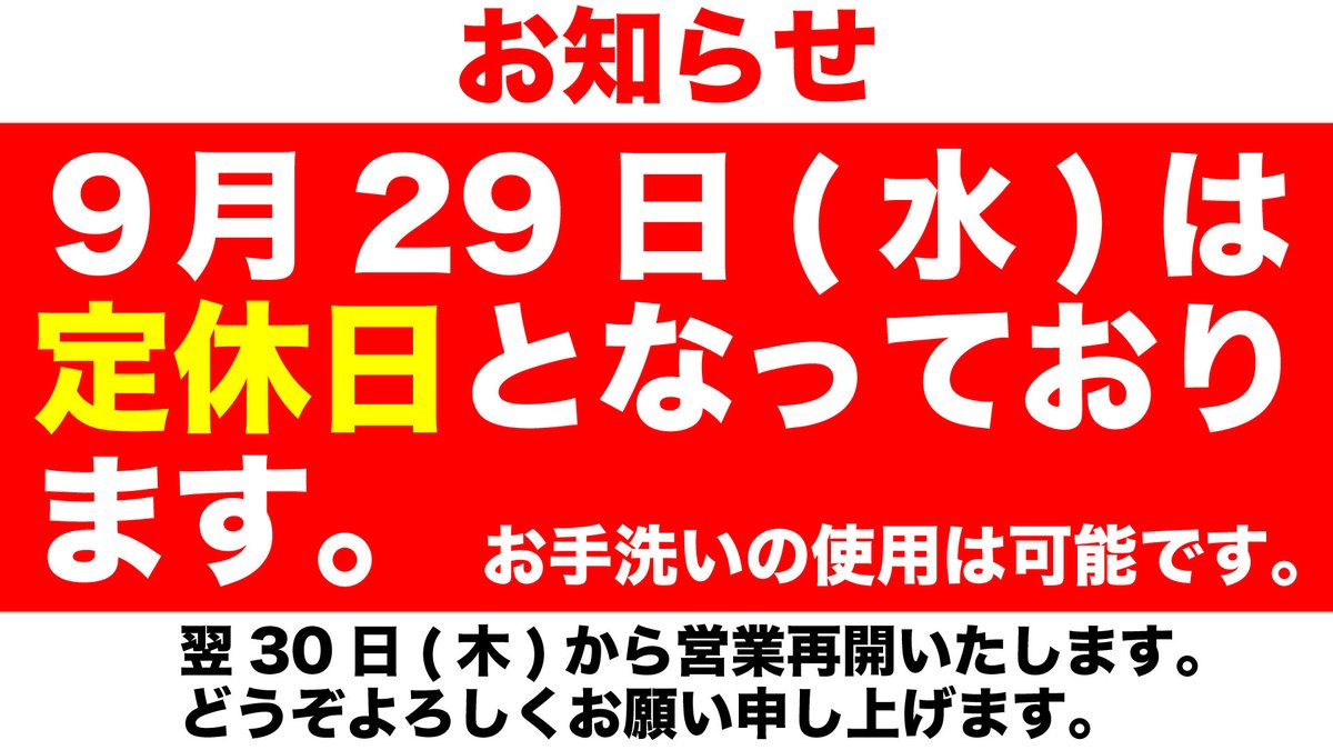 9月29日(水)は定休日につきお休み致します。