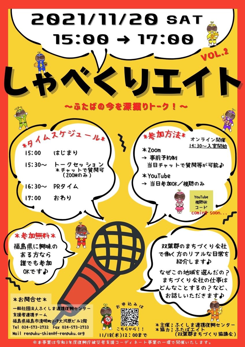 双葉郡8町村に関心がある方に向けて「しゃべくりエイト〜ふたばの今を深堀りトーク〜」がオンライン開催されます。11月20日(土)15...