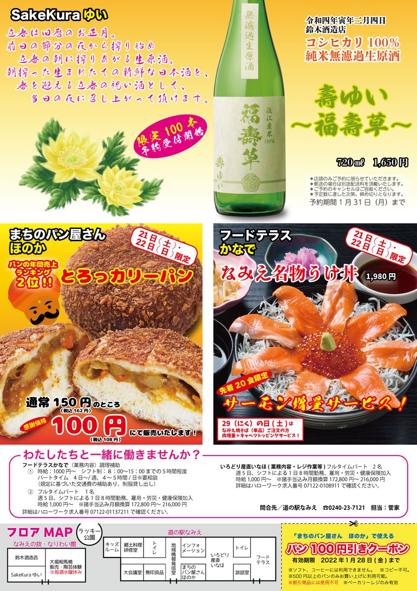 いつも「道の駅なみえ」をご利用いただきまして誠にありがとうございます。 1月28日(水)は定休日につきお休みとなります。 お手洗いは通常通りご利用可能...