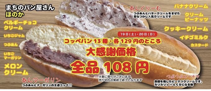 まちのパンさんほのかでは本日と明日、週末フェアとして、コッペパン全品108円(税込)サービスを行っています!