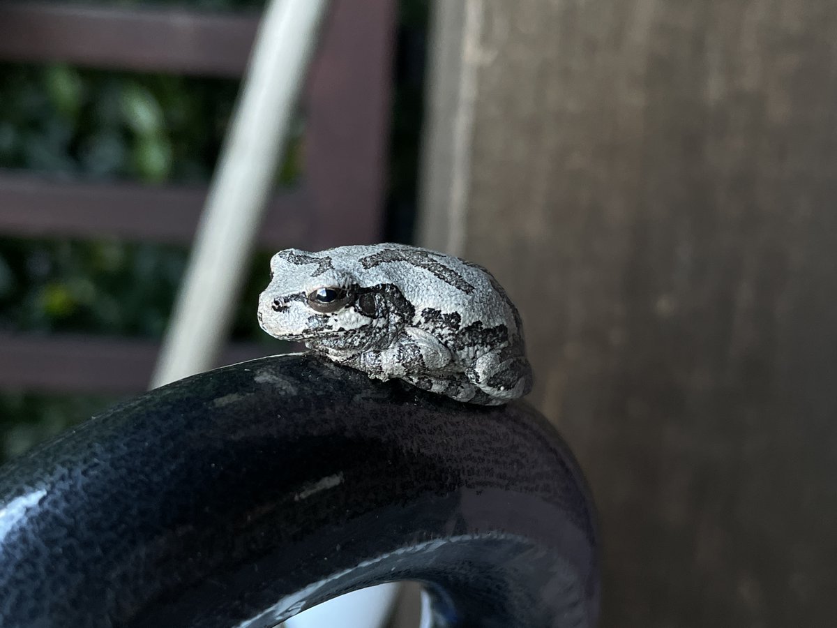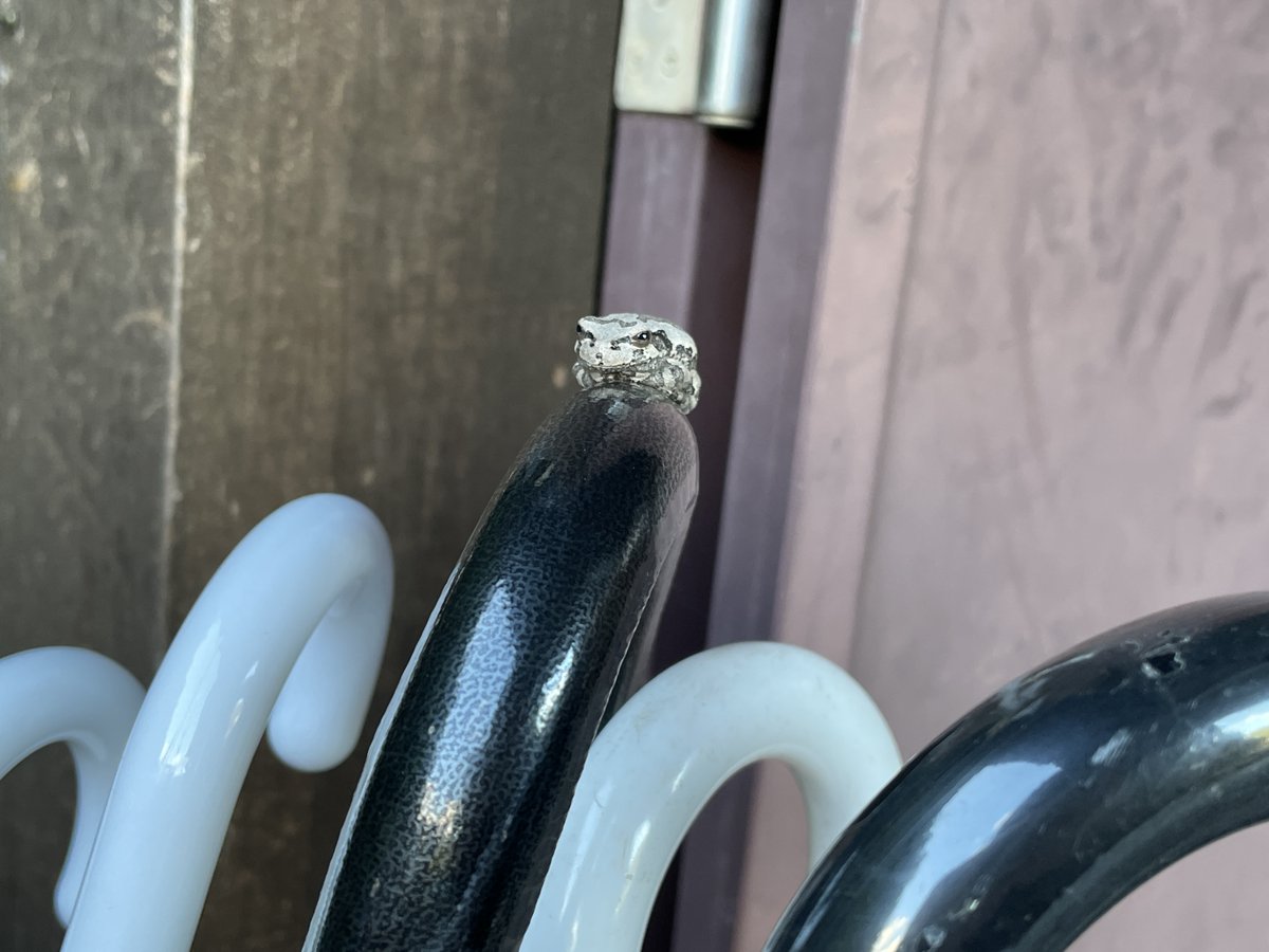 本日のカエルさんは傘立てに入っている傘の持ち手におりました。