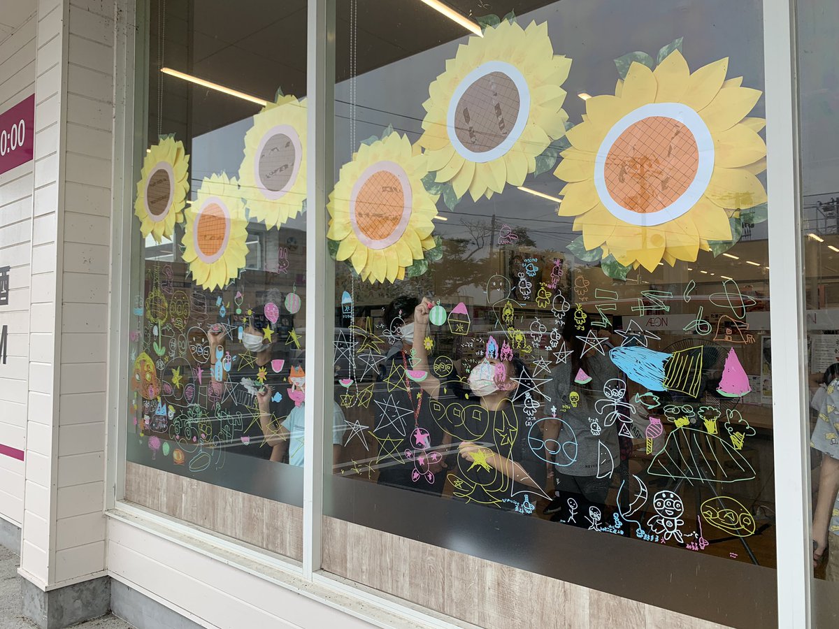 【夏だーっ🌻✨】イオンさんのまどに、子どもたちがお絵かきしてくれて、パッとはなやかになったよ〜✨うけどんも描いてくれたの💛...