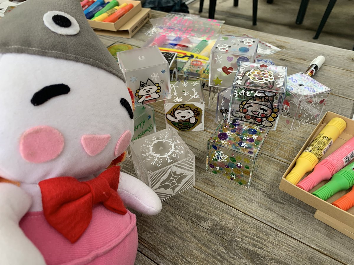 【キラキラ✨イルミキューブ✨】今日、まち・なみ・まるしぇで透明のキューブにお絵かきしたんだ!🌟うけどんのキューブもあったのっ...