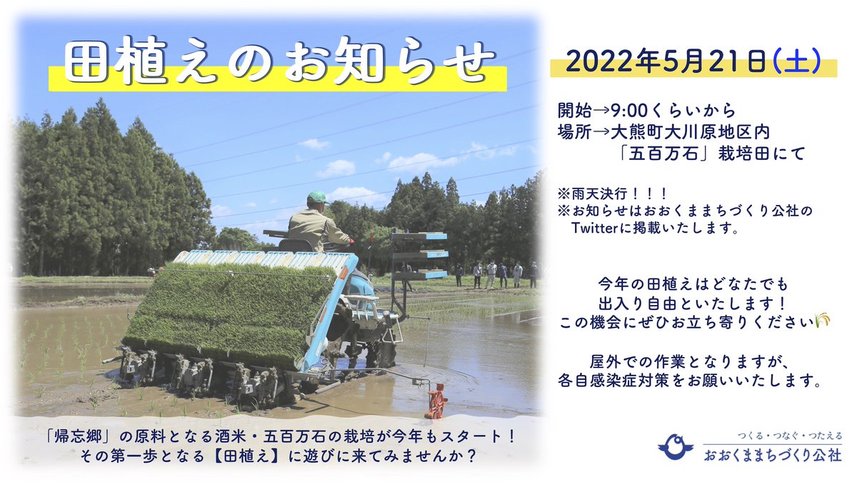 【田植えのお知らせ】「帰忘郷」の原料となる酒米・五百万石の栽培が今年もスタート!今年の田植えは出入り自由!この機会にぜひ...