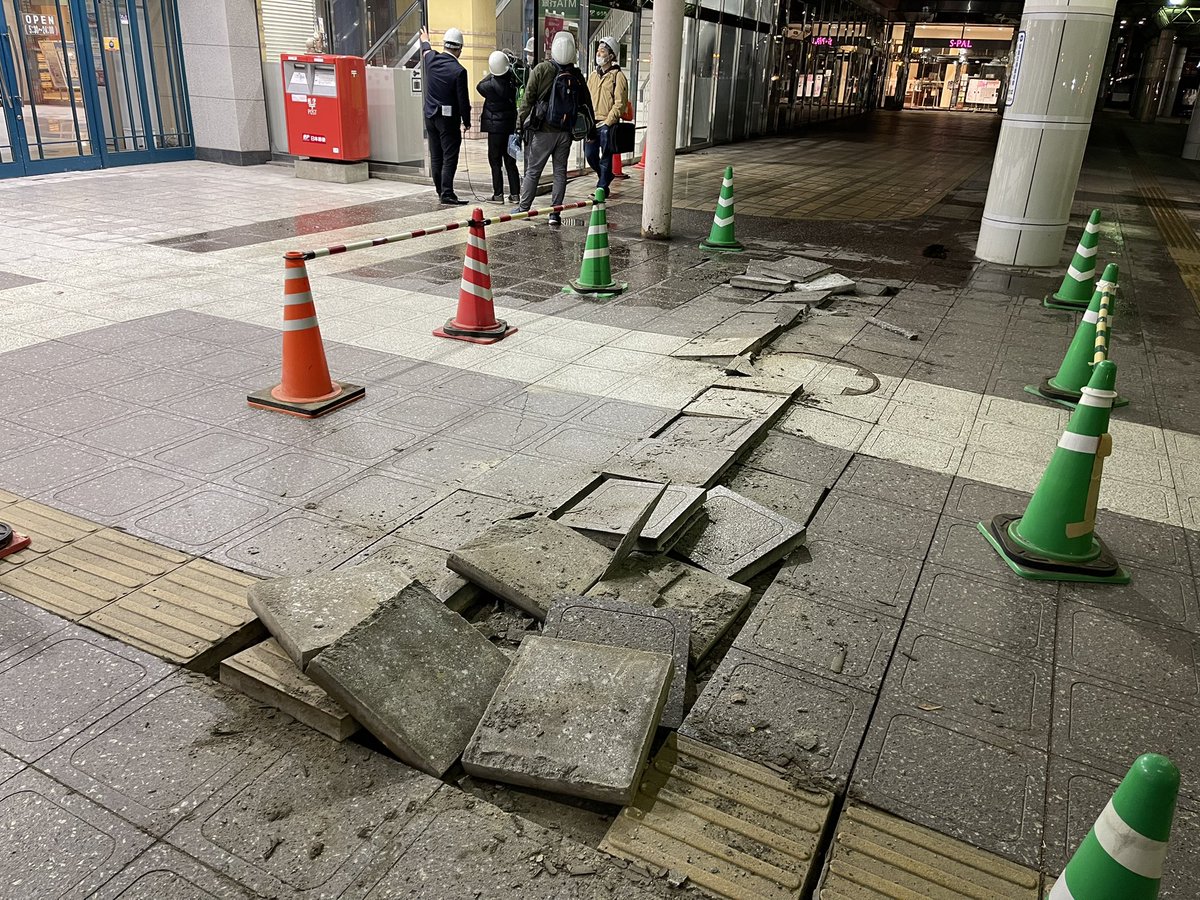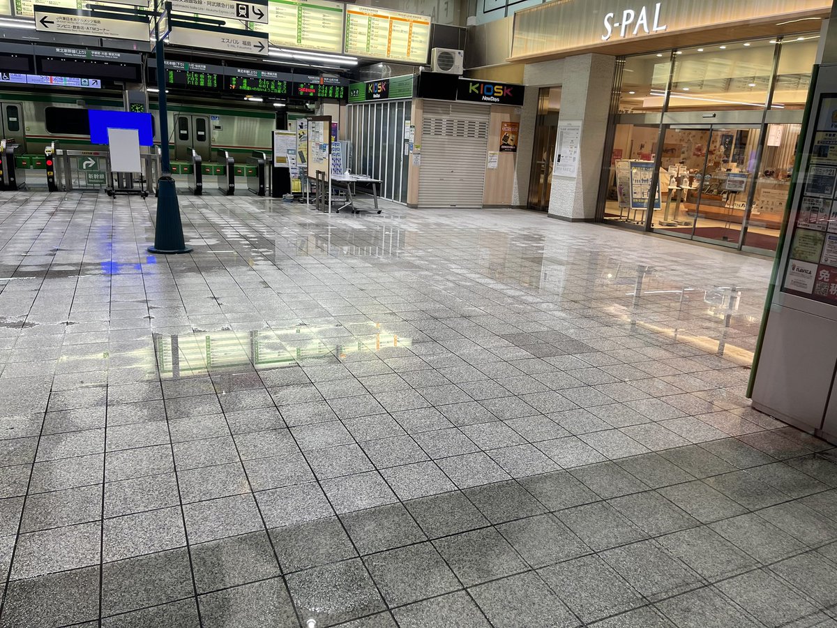 JR福島駅前地下歩道出口のタイルがめくれ上がるなどの被害が出ています。また駅構内は漏水と見られる水たまりがいくつもできています。