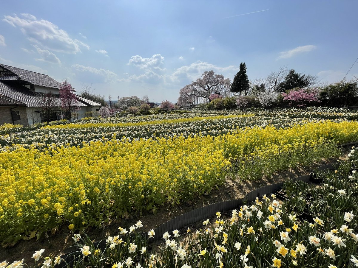 #ふくしま桜紀行 金毘羅桜、西側の道路側からが正面とすれば、裏側東側には菜の花、水仙の花が一面に咲く花畑が広がっています。桜とさまざまな花のコラボレーションが来場者の目を楽しませています。