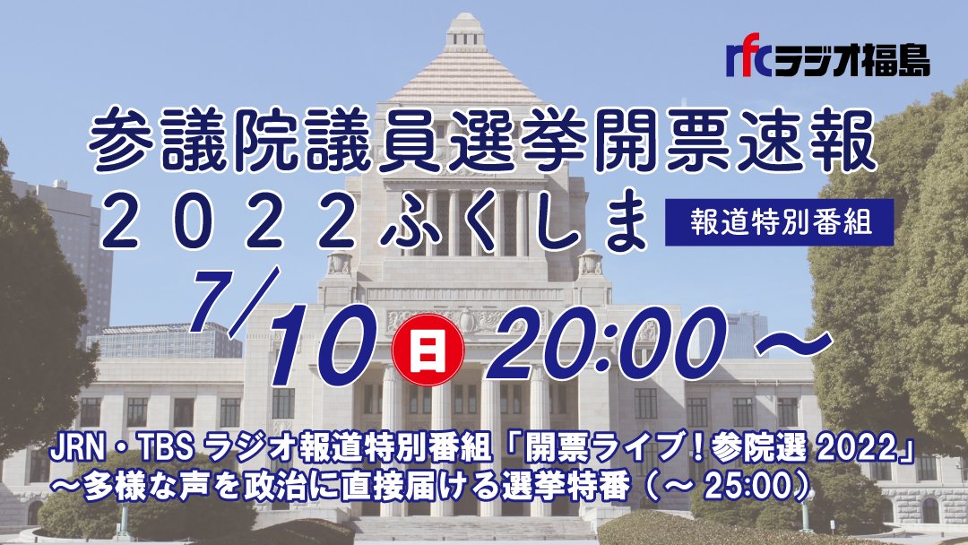 第26回参議院議員通常選挙が7月10日(日)に行われます。ラジオ福島では、福島民報社編集局に特設スタジオを設置し、福島民報社五十嵐論説委員長の解説、手塚伸一アナウンサーの進行で、「報道特別番組・参議院議員選挙開票速報2022ふくしま」を午後8時より9時まで放送します。