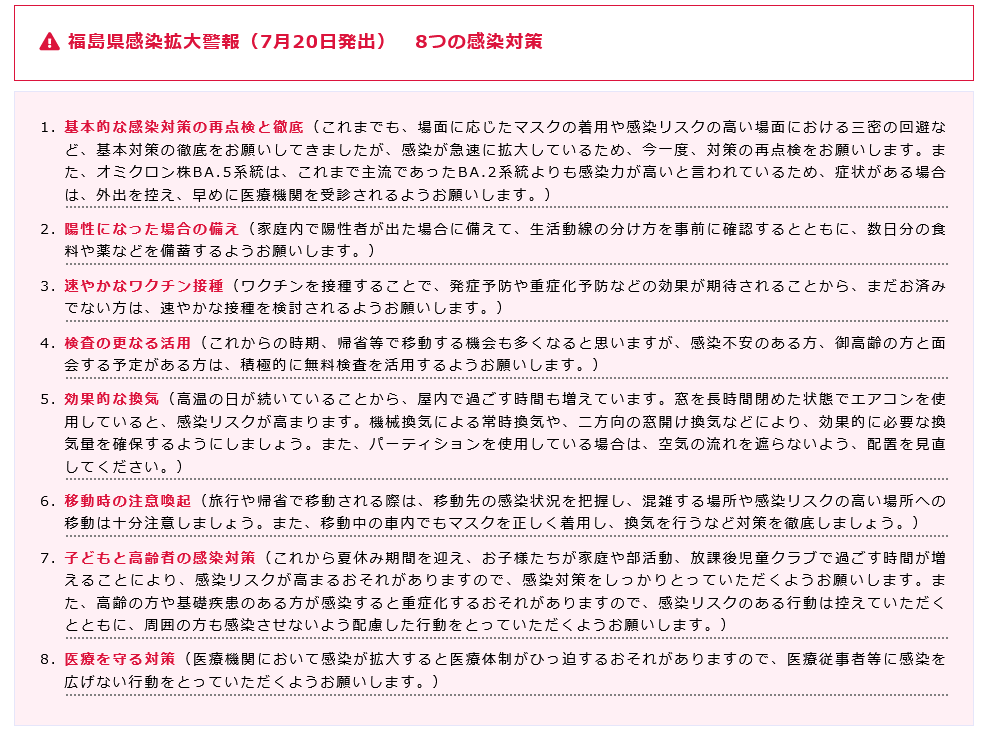 #福島県 は7月20日、更なる #新型コロナ 感染拡大を抑えるため 、8つの感染対策「#福島県感染拡大警報」を 発出しました。詳しくはラ...