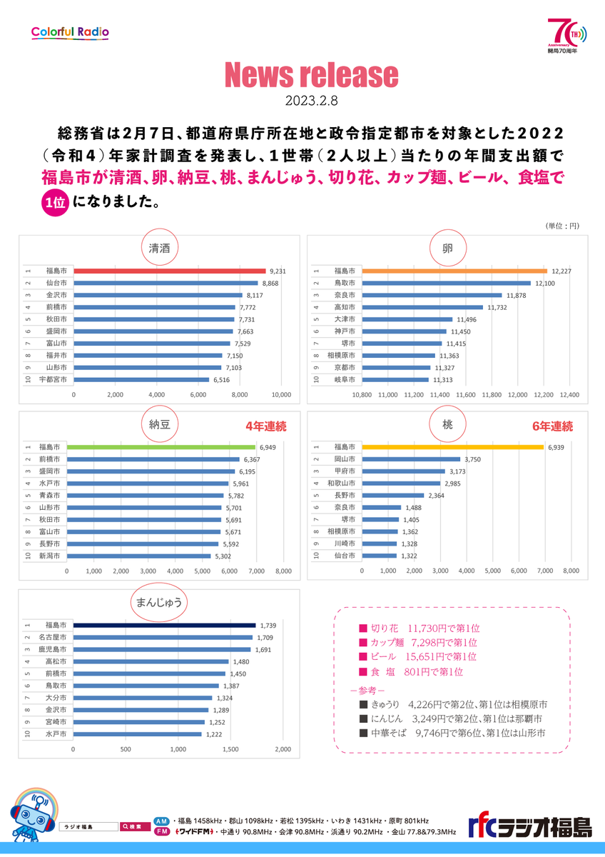 総務省は2月7日、都道府県庁所在地と政令指定都市を対象とした2022(令和4)年家計調査を発表し、1世帯(2人以上)当たりの年間支出額で福島市が清酒、卵、納豆、桃、まんじゅう、切り花、カップ麺、ビール、食塩で1位となりました。