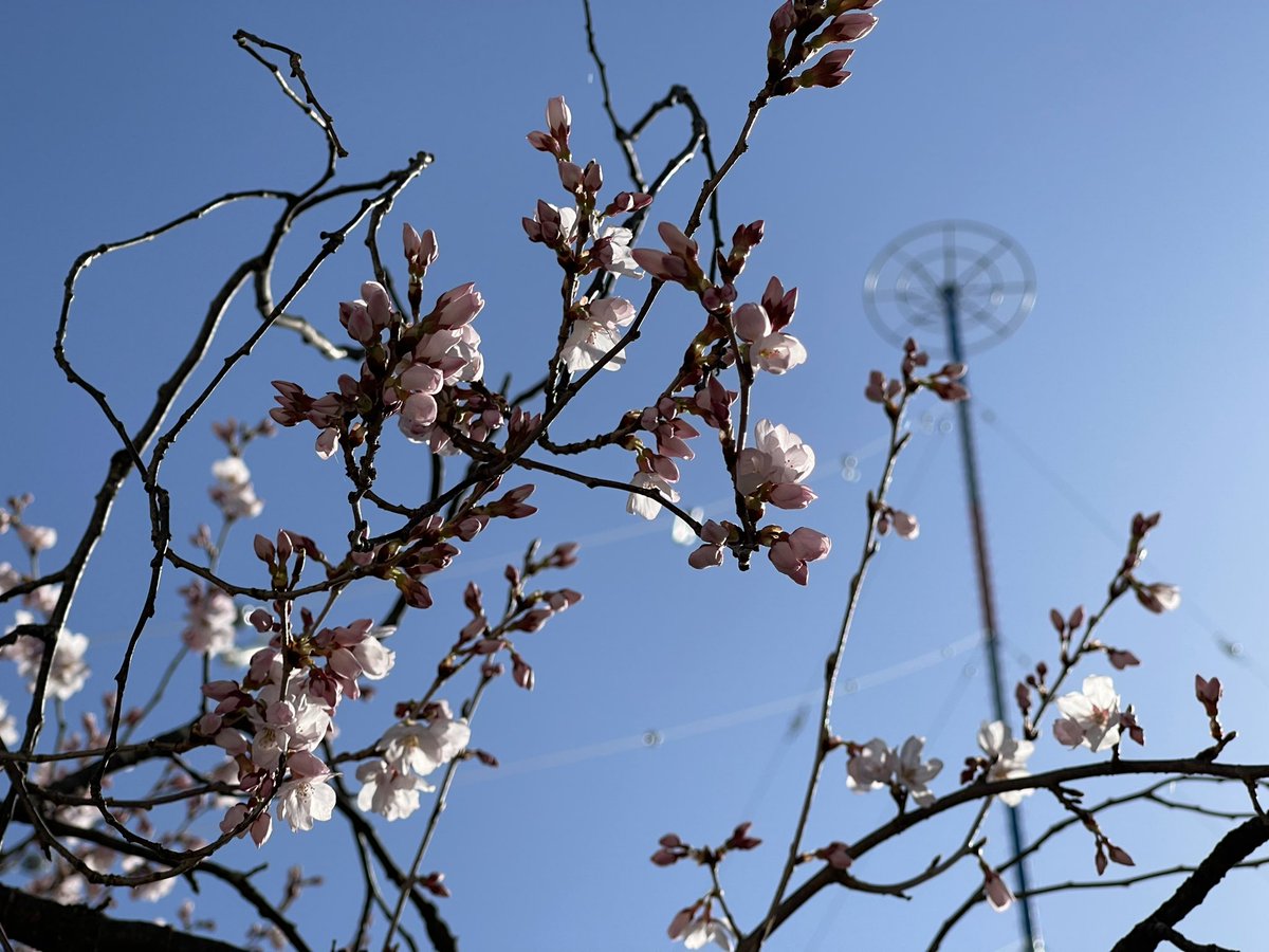 ラジオ福島スタジオ前の桜。河津桜が咲き始めました。ソメイヨシノの蕾もいっそう膨らみを増しています。