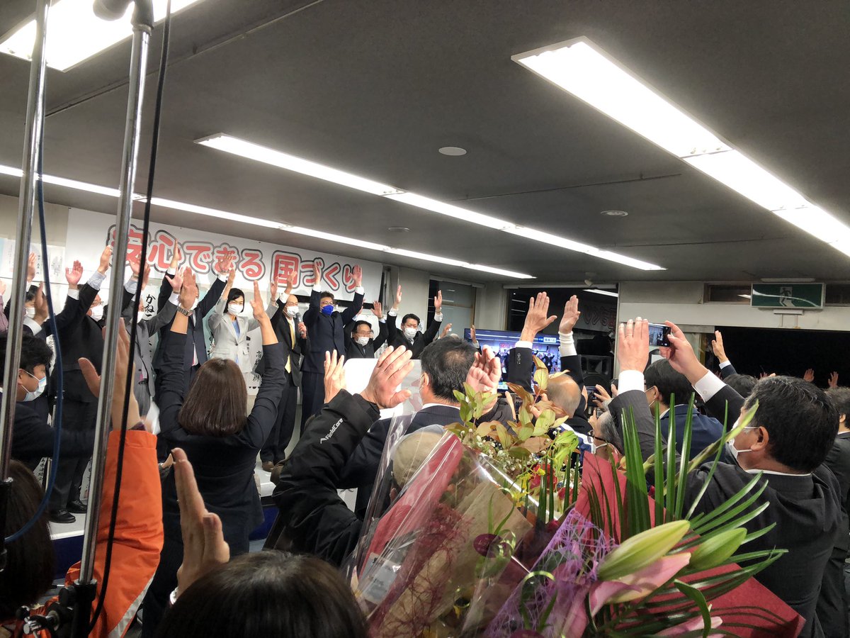 午前0時10頃、選挙事務所独自の判断で、支援者とともに万歳をする金子恵美子候補。