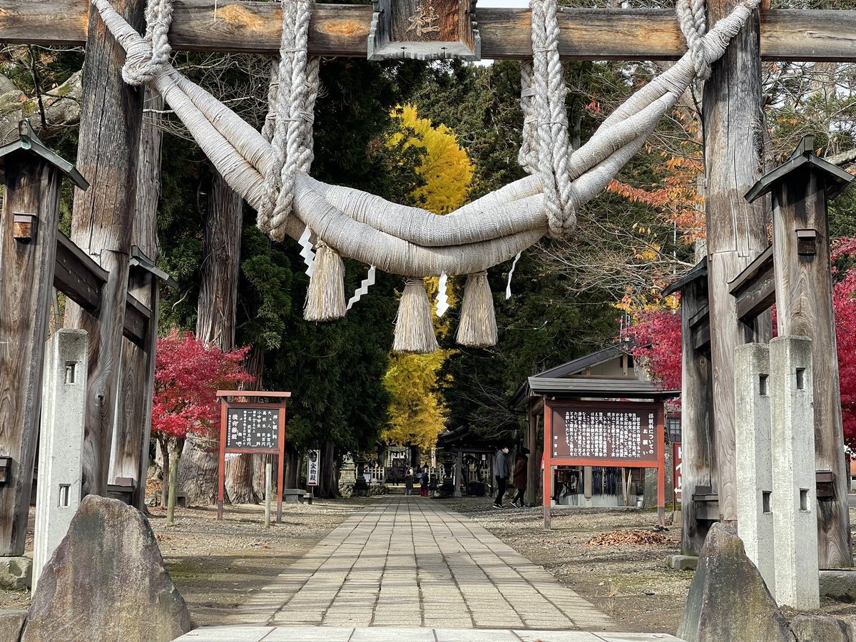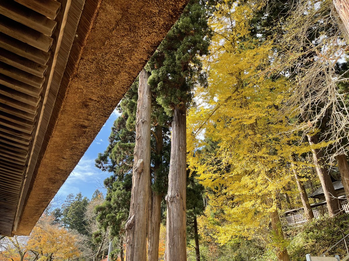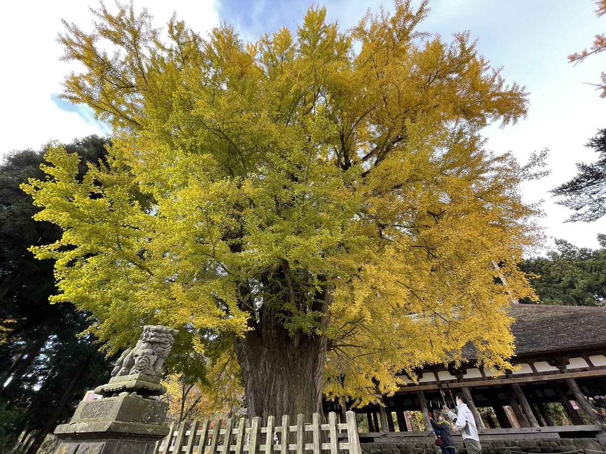 紅葉名所ツアー。今日は喜多方市新宮熊野神社長床の大イチョウを訪ねてやってきました。上の方には緑の葉も見られましたが、地面には黄色の落ち葉の絨毯が広がり、まさに見頃の時期にレポートができました。