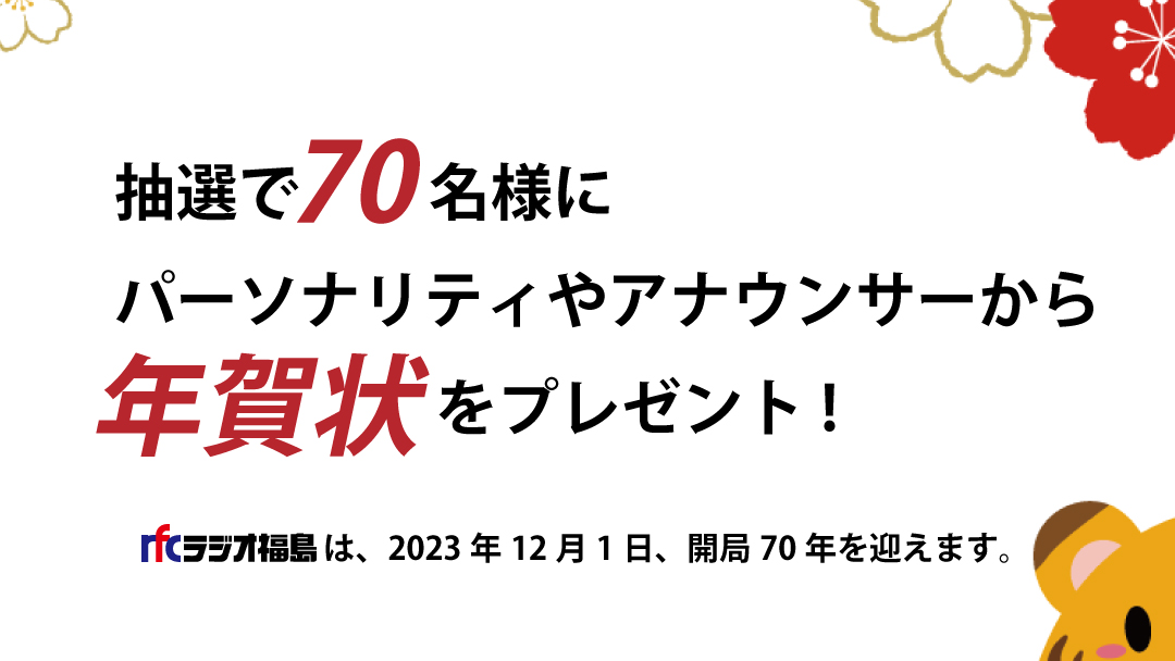 2022年も目前! ラジオ福島では、抽選で70名様に、パーソナリティやアナウンサーからの年賀状をプレゼントいたします。ご希望の方は、氏名、住所、電話番号など必要事項と番組へのメッセージを書いて、ご応募ください。