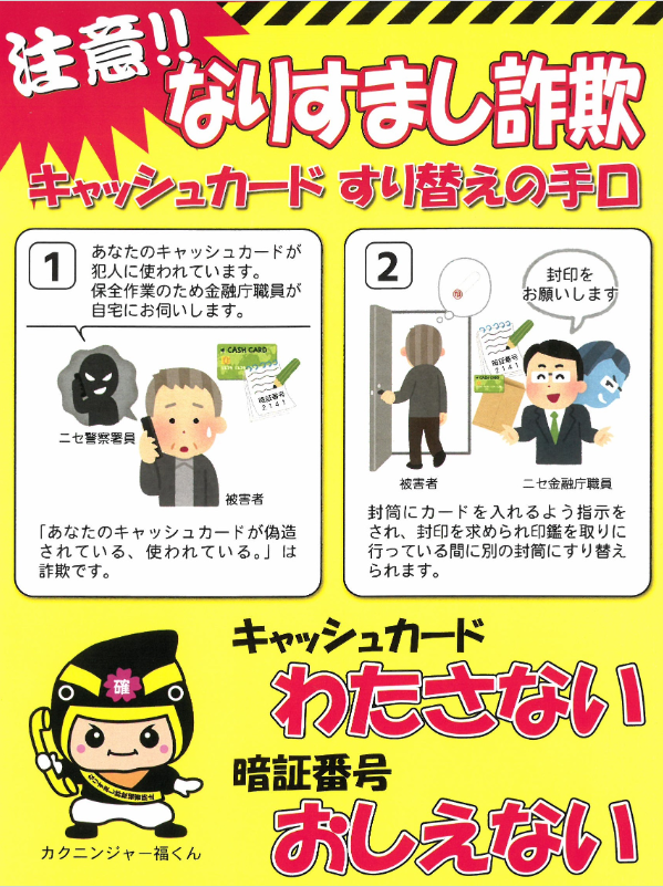 本日12月1日、福島市居住の80歳代女性が、キャッシュカードすり替えの手口で、口座から現金約80万円を引き出される被害を受けました。年末は、なりすまし詐欺被害が多い時期です。ご注意ください。