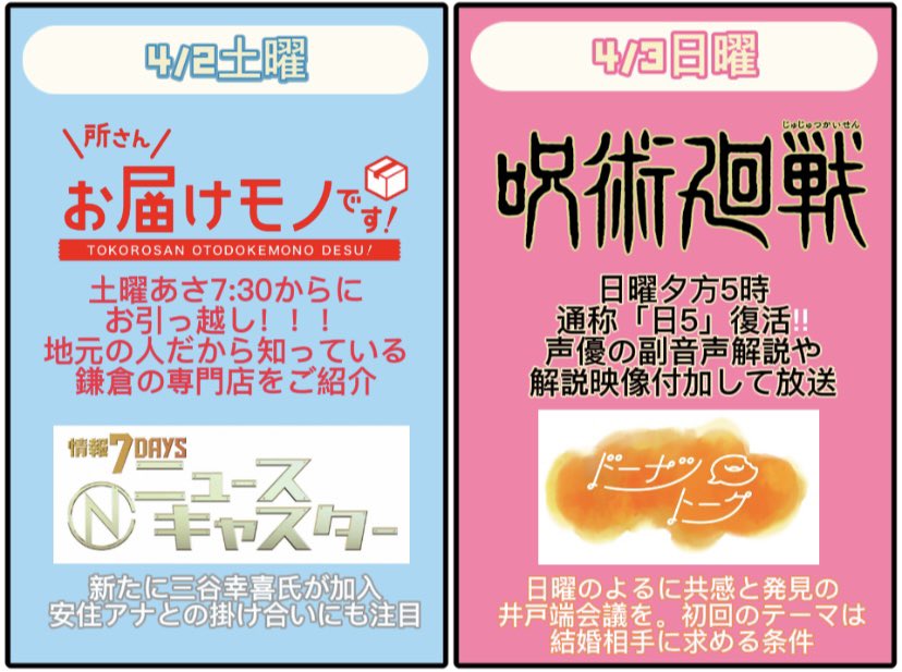 明日から新年度!ということで今週末の注目番組をまとめてみました✨新しい番組はもちろんお引っ越ししたりリニューアルしたり…...
