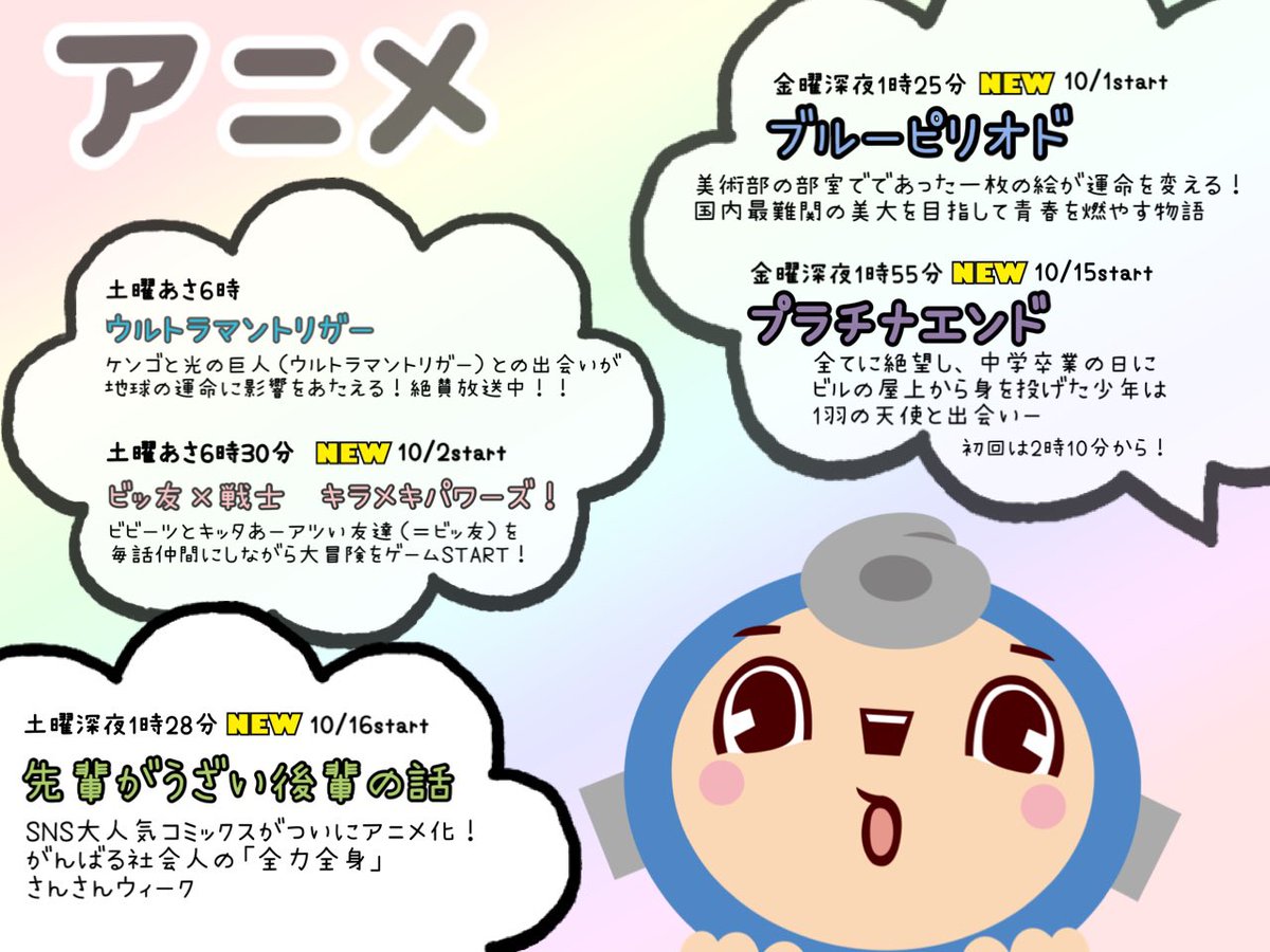 【アニメざんまい】10月放送 主なアニメをまとめました。🎨今夜1:25から #ブルーピリオド 🌟明日あさ6:30から #キラメキパワー...