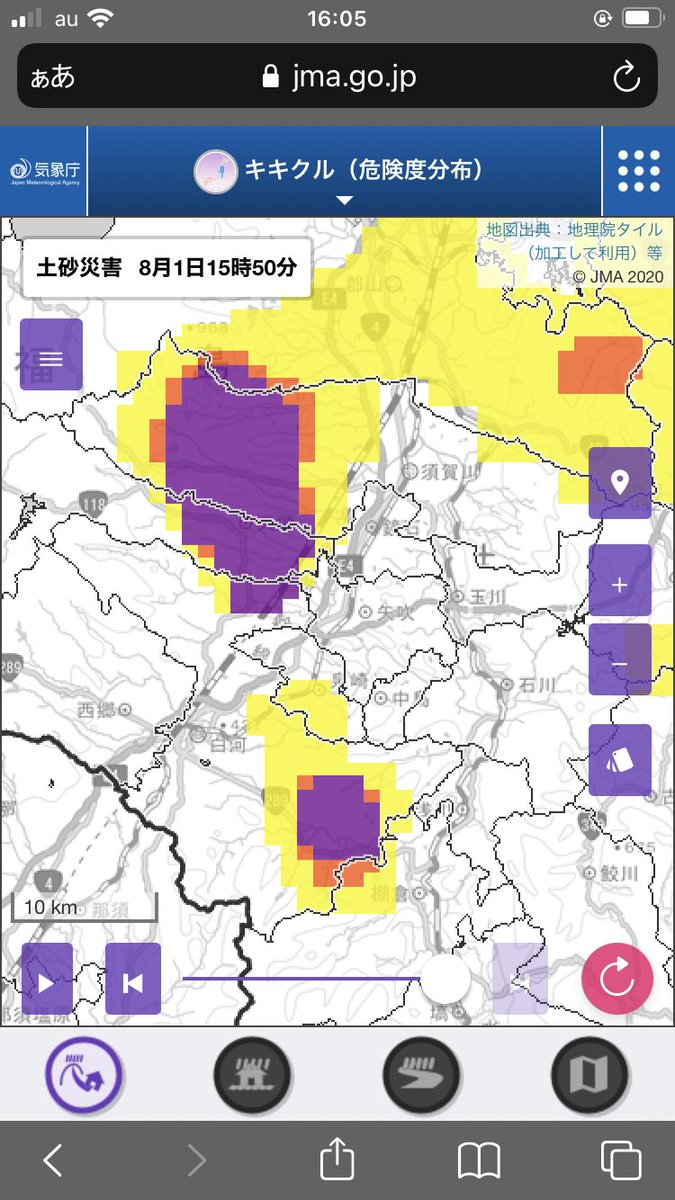 画像のキキクル(危険度分布)では、須賀川市西部と矢吹町などで危険度が高まっています。山や崖の近くから離れてください。