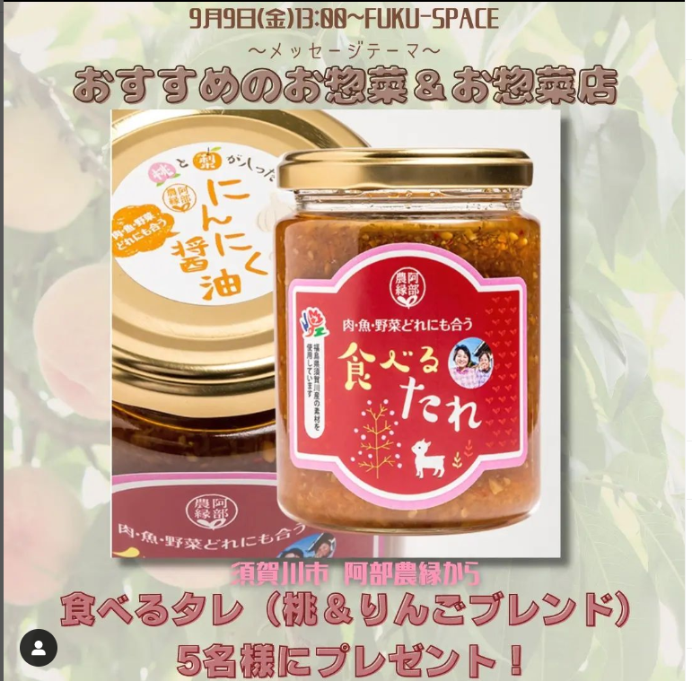 🔊9/9(金)13:00~ #FUKUSPACE 🗣テーマ「おすすめのお惣菜&お惣菜店」/須賀川市 #阿部農縁 から『桃とりんごの食べるたれ』を5...