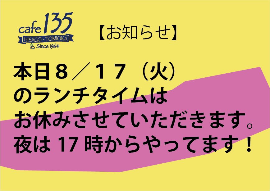 【お知らせ】本日8/17(火)のランチタイムはお休みさせていただきます。あいすいません。