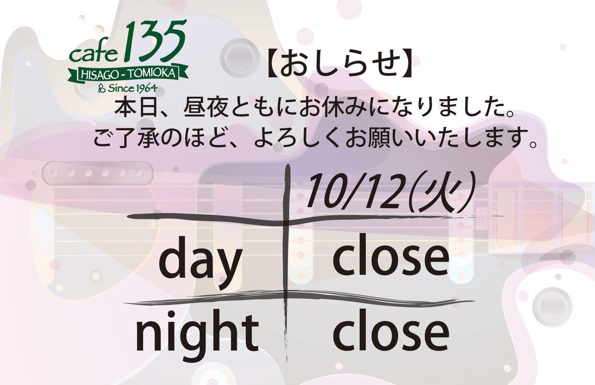 【お知らせ】本日10/12(火)お休みになりました。たいへん申し訳ありませんがご了承のほどよろしくお願いします。