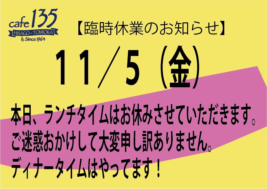 【おしらせ】本日11/5(金)のランチタイムおやすみです。夜はやってます。