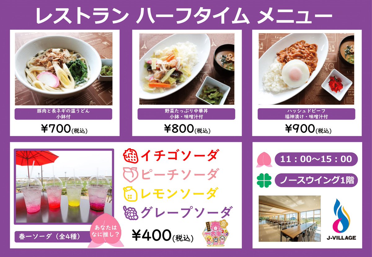 🌸4/23(土)・4/24(日)🌸🥤ランチメニューのご紹介🍛Jヴィレッジ館内にある、レストラン「アルパインローズ」「ハーフタイム」ではイベン....