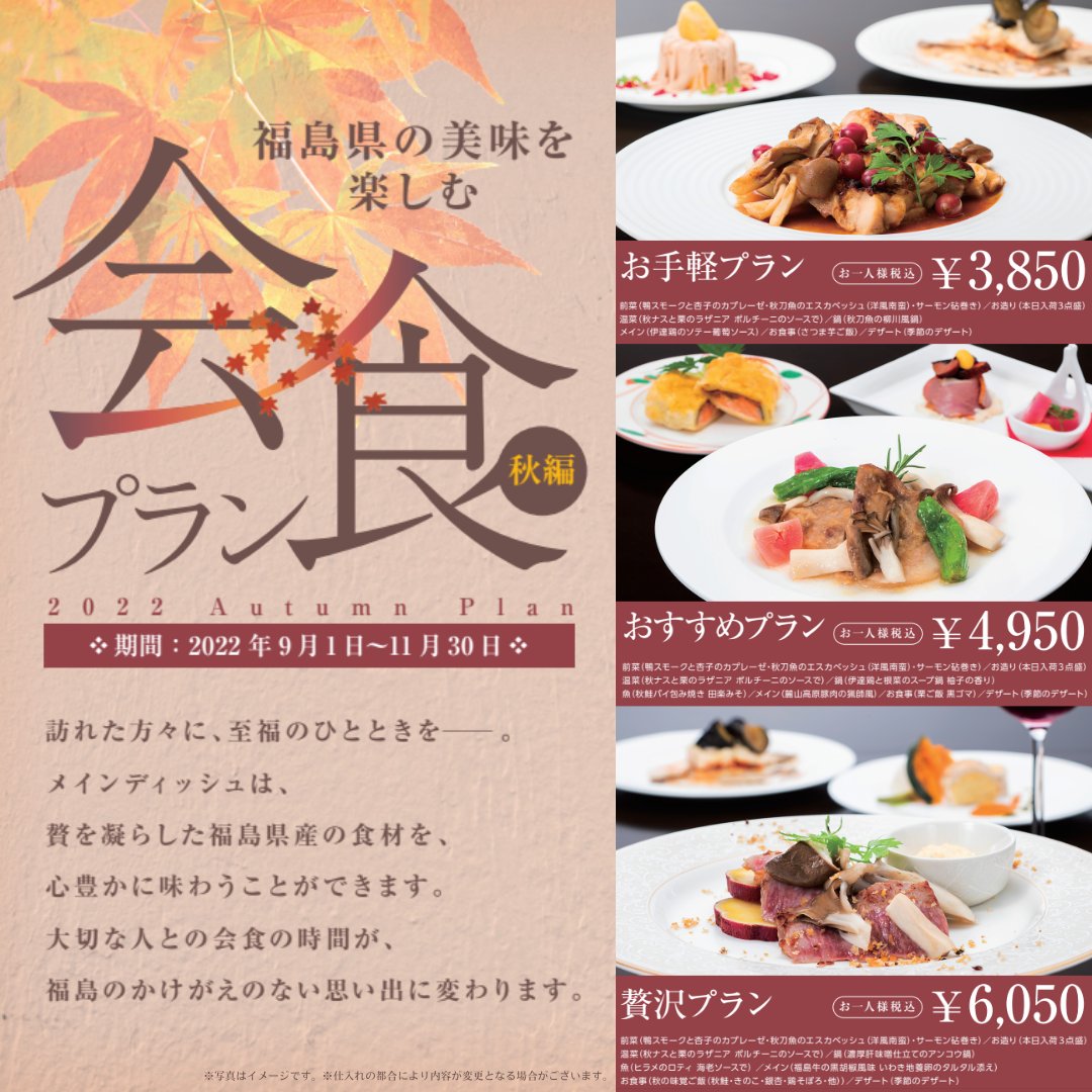 🍠会食プラン(秋編)🍂好評販売中🌰今年は、”福島県の美味を楽しむ会食プラン”をテーマに、福島牛など県産ブランド肉を使用したメニュー...