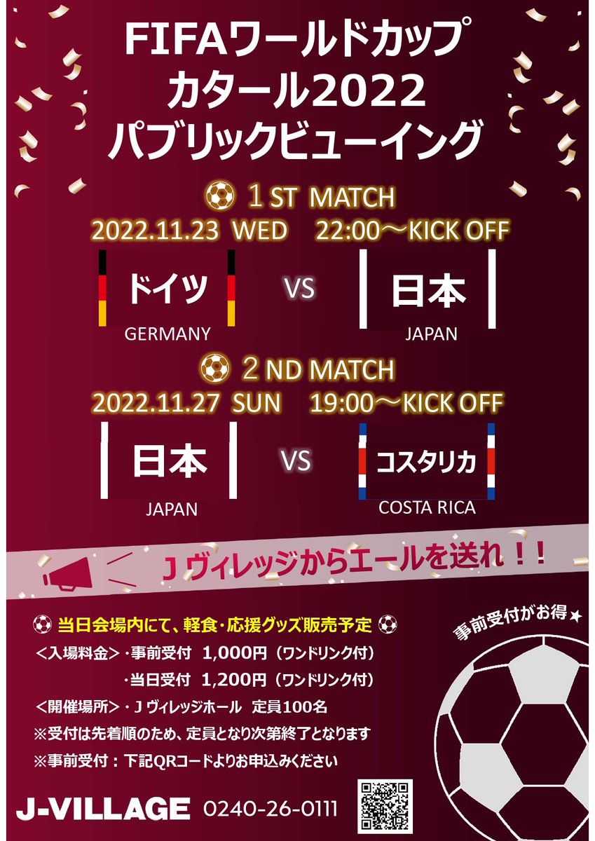FIFAワールドカップカタール2022パブリックビューイング開催!📣11/23(水祝)「ドイツvs日本」11/27日(日)「日本vsコスタリカ」の2...